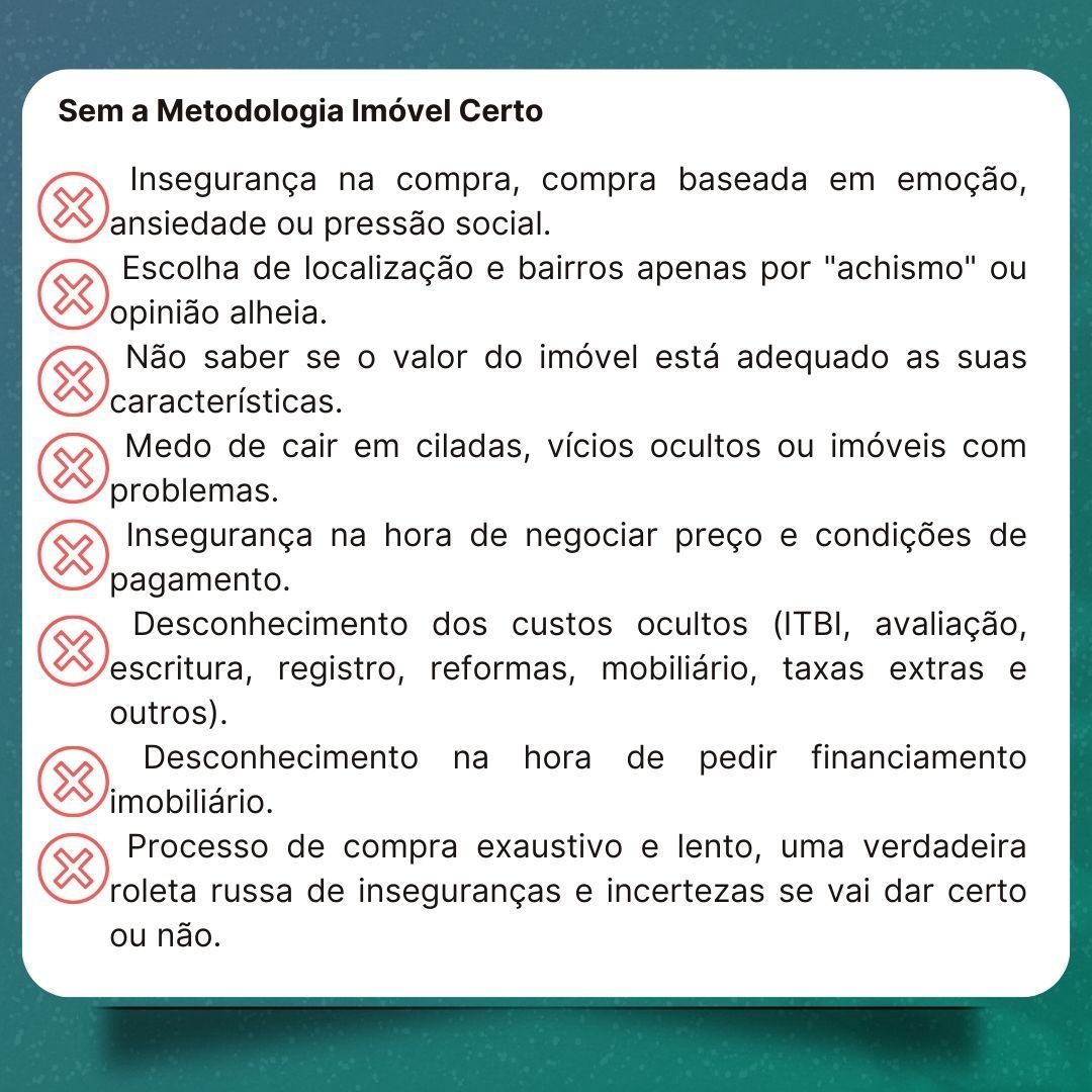 E foi nessa busca que eu encontrei padrões e características que fazem com que alguns imóveis sejam perfeitos! Então, a partir dessas analises encontrei padrões e características nos imóveis que fazem com que ele seja um "imóvel perfeito". A partir daí criei um método claro e seguro para usar sempre que quero comprar um novo imóvel. E decidi compartilhar com você esse método para te ajudar a comprar o imóvel certo — com confiança, economia e estratégia.