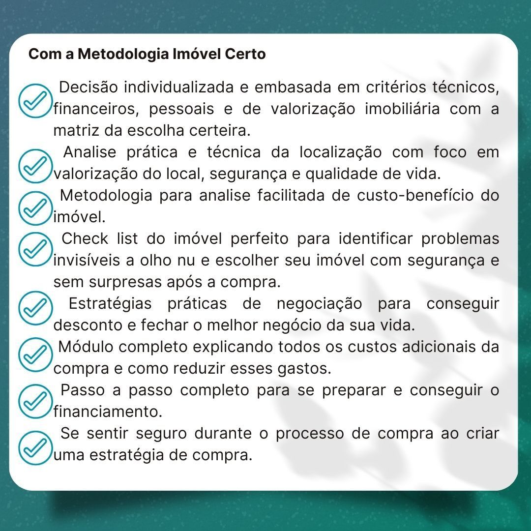Se você ainda está em dúvida se deve ou não comprar um imóvel você está no local perfeito, pois além a metodologia já começa com uma Masterclass com planilha exclusiva para você calcular se financeiramente é viável ou não para o seu caso comprar um imóvel , além de analisar outros pontos que precisam ser levados em consideração antes dessa tomada de decisão.